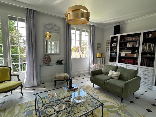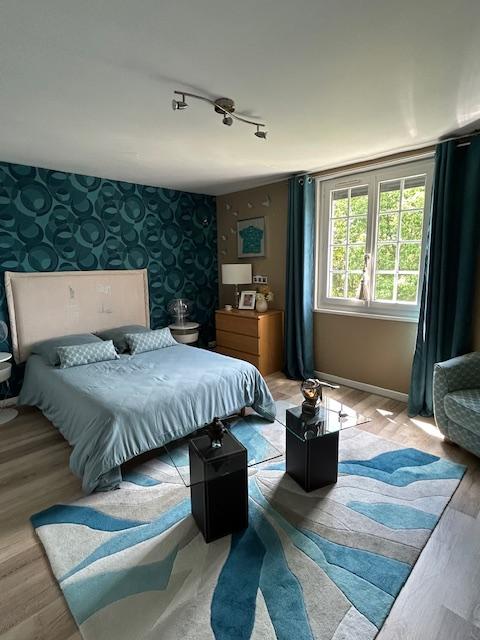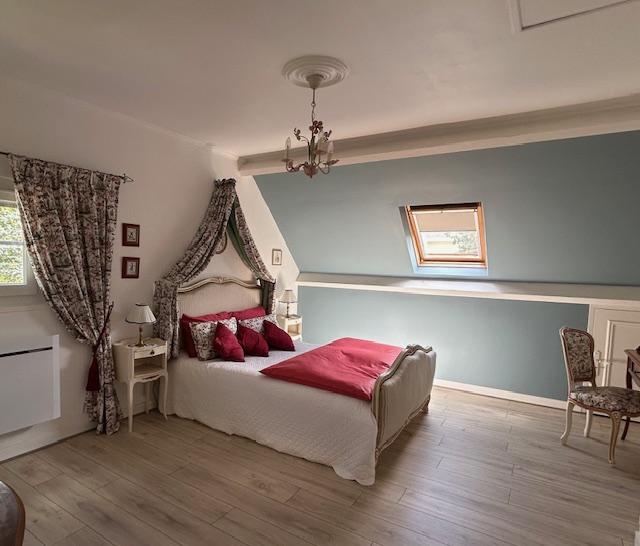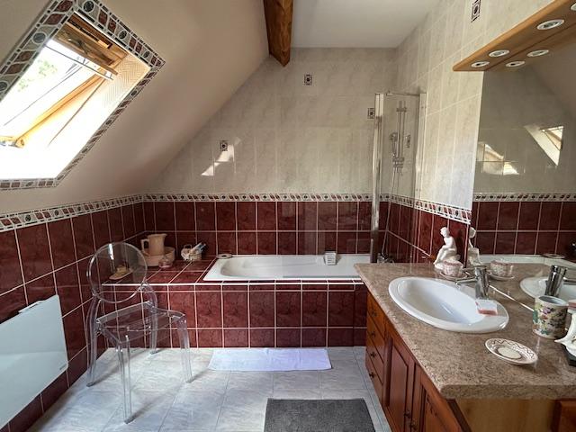A l'étage, un palier avec coin bureau, une première chambre avec dressing et cabinet de toilette intégré, une seconde chambre avec salle de bains communicante, un W.C. et deux greniers séparés.